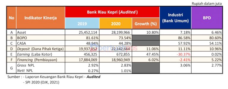 Beberapa capaian indikator penting perbankan ini menunjukkan pertumbuhan signifikan dan memuaskan, misalnya dari sisi pertumbuhan aset. Pada tahun 2020, aset Bank Riau Kepri mengalami peningkatan hingga 10,80% atau Rp28,19 triliun jika dibandingkan tahun 2019 yakni Rp25,45 triliun.